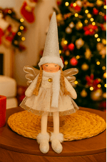 Boneca Decorativa Natalina com Asas perfeita para deixar sua decoração de Natal ainda mais encantadora. Com vestido em tule brilhante, gorro pontudo e asas douradas, essa boneca transmite leveza e delicadeza. Ideal para compor aparadores, mesas e prateleiras, harmonizando com decorações natalinas em tons claros e sofisticados.