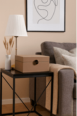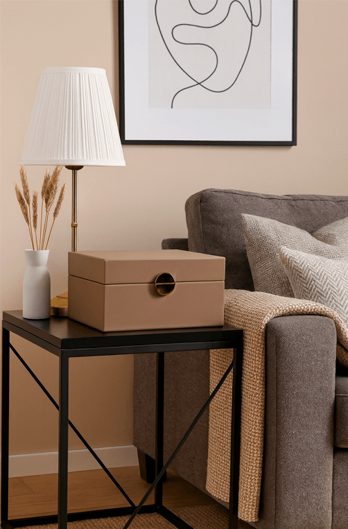 A caixa decorativa em MDF com revestimento em PU bege é o item perfeito para quem busca organização com elegância. Seu acabamento liso e sofisticado combina com diferentes estilos de decoração do moderno ao clássico enquanto o detalhe dourado na frente adiciona um toque de luxo. Ideal para guardar joias, acessórios, documentos ou lembranças, esta caixa une funcionalidade e design refinado.