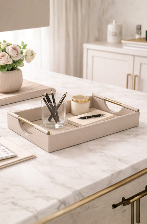 A Bandeja Pequena Aura Nude é ideal para organizar e decorar com elegância. Produzida em MDF com revestimento em PU, possui design moderno e acabamento sofisticado, perfeita para mesas, aparadores, bancadas e uso no dia a dia.