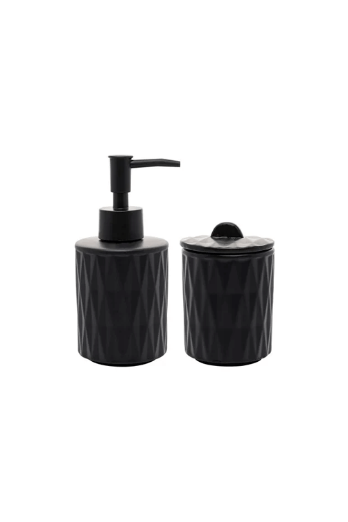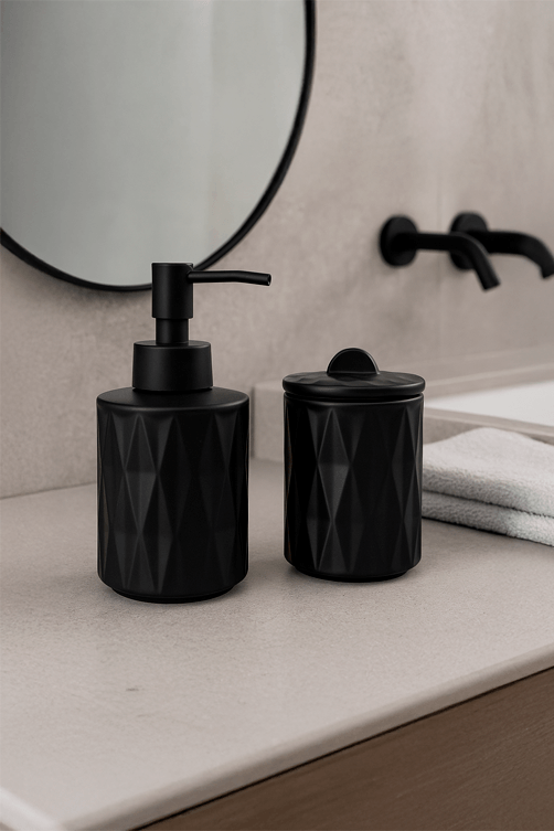 O Conjunto de Banheiro Deli Diamond Preto em Cerâmica une sofisticação e praticidade em peças essenciais para o dia a dia. Com design elegante e detalhes lapidados que lembram o brilho do cristal, traz modernidade e requinte ao ambiente. Ideal para organizar com estilo e transformar o banheiro em um espaço mais acolhedor e funcional.