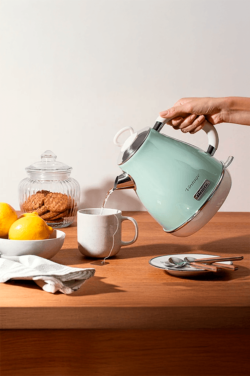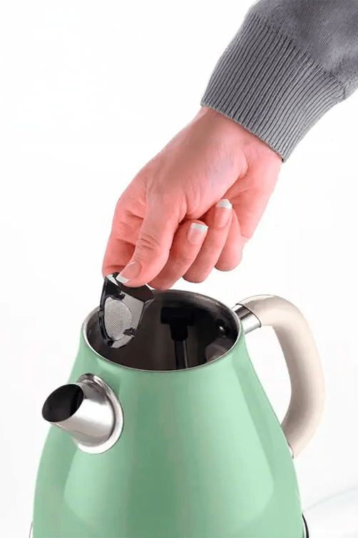 Chaleira elétrica Ariete em verde vintage com capacidade de 1,7 litros, equipada com base giratória 360 graus para conveniência máxima. O design retrô evoca elegância atemporal, enquanto a tecnologia moderna garante aquecimento rápido e eficiente. A base rotativa oferece flexibilidade de uso em qualquer posição da cozinha. Um complemento sofisticado que une funcionalidade e estética clássica.