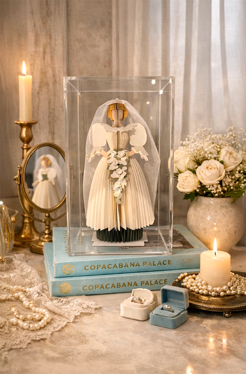 A Escultura Decorativa Diana Noiva Fashion de Papel em Caixa de Acrílico é uma peça artística delicada e sofisticada, inspirada na elegância atemporal da princesa Diana. Confeccionada em papel dobrado artesanalmente, a escultura reproduz com riqueza de detalhes um vestido de noiva clássico, com véu, flores e acabamento refinado.