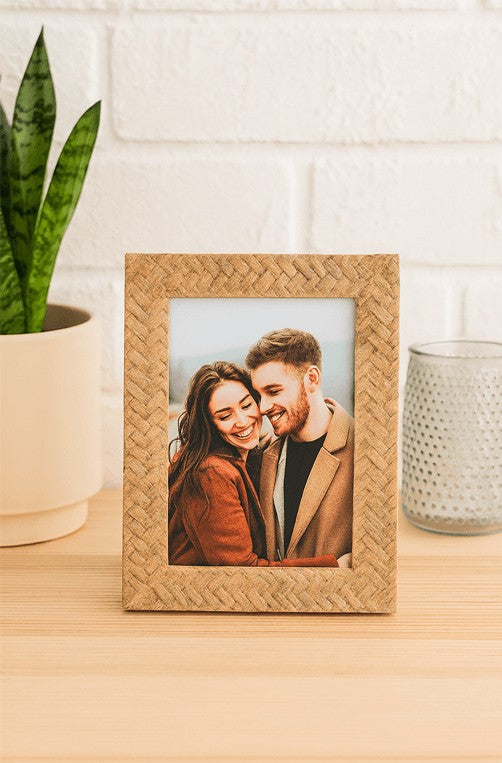 Porta retratos em polirresina e vidro 10x15cm (18,5 x 13,5 x 1,5 cm), com acabamento natural que imita fibras trançadas e traz um toque rústico e sofisticado para a decoração. Ideal para expor fotos especiais em ambientes como sala, quarto ou escritório, combinando perfeitamente com estilos modernos, boho ou minimalistas. Uma peça versátil que valoriza suas memórias e complementa a decoração com charme e elegância.
