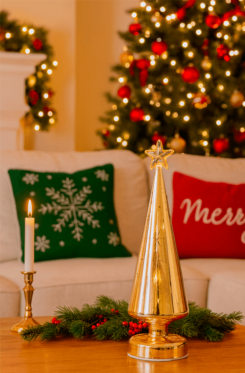 Vela Natalina em Vidro Dourado com LED Pequena 30cm peça sofisticada que ilumina sua decoração de Natal com charme e elegância. Ideal para complementar mesas postas, aparadores e ambientes festivos, trazendo brilho dourado e aconchego à sua casa.