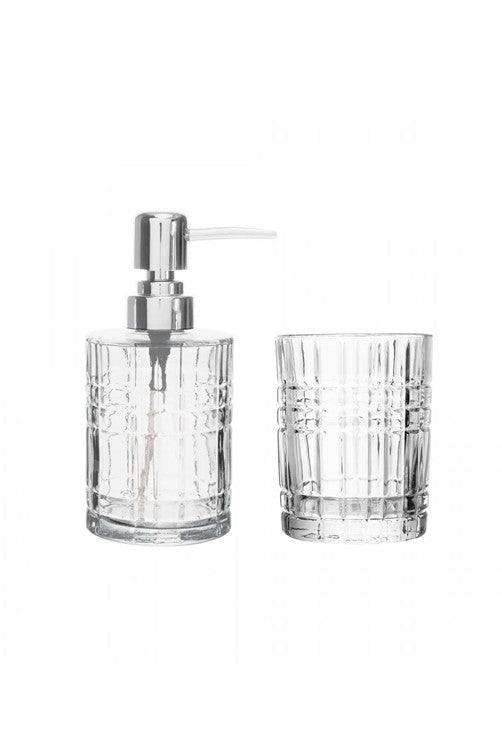 Adicione sofisticação ao seu banheiro com o Conjunto de Vidro Diamond. Composto por um porta-sabonete líquido com válvula cromada e um copo multifuncional, este conjunto une elegância e praticidade. O design em vidro transparente com textura geométrica traz um toque moderno e luxuoso à bancada. Ideal para manter a organização com estilo.