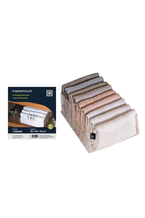 A Colmeia Natural com Divisórias é perfeita para quem busca uma organização prática, funcional e com visual clean. Feita em material natural e resistente, possui divisórias internas ideais para separar peças íntimas, meias, acessórios, roupas de bebê ou itens diversos. Seu formato retangular otimiza o espaço em gavetas e prateleiras, mantendo tudo visível, acessível e bem distribuído.