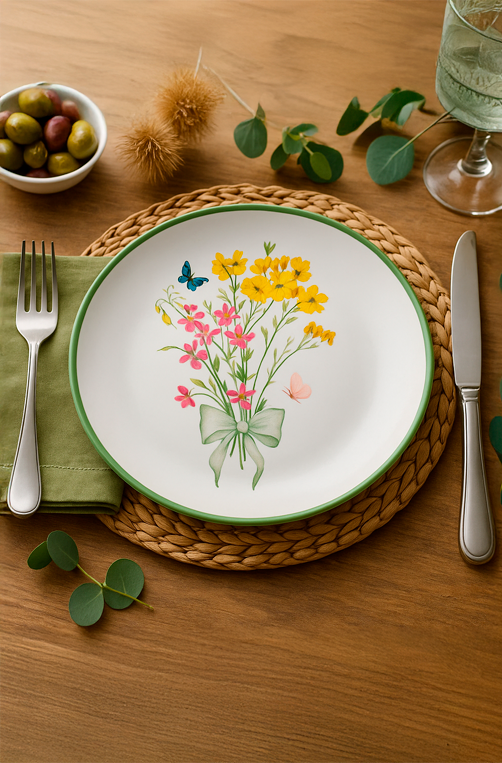 O Prato de Sobremesa Coup Floral é a escolha ideal para quem ama composições leves e cheias de encanto na mesa posta. Com estampa delicada de flores e borboletas, ele traz um toque de frescor e alegria para o seu dia a dia, perfeito para servir doces, frutas, bolos e pequenas refeições. O filete verde ao redor da borda valoriza ainda mais o design, criando harmonia com peças de louça branca, fibras naturais e elementos inspirados na natureza.