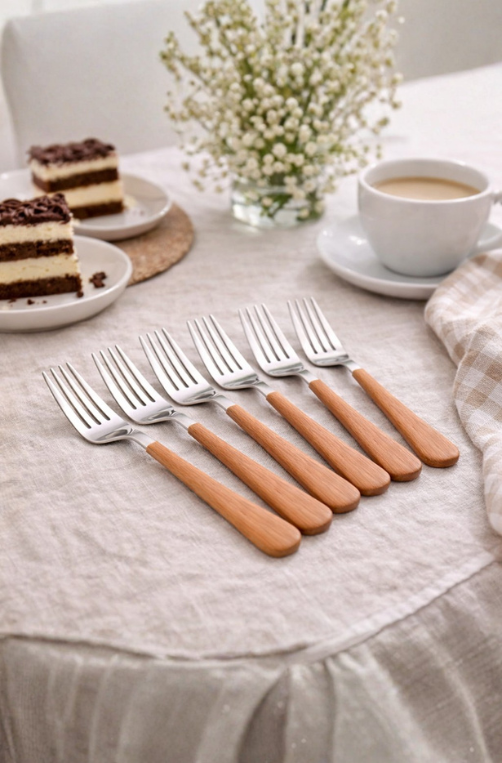 O cabo em plástico com efeito amadeirado traz aconchego visual e sofisticação, remetendo à madeira com a praticidade do plástico. Com 16,5cm de comprimento, são perfeitos para servir bolos, tortas, sobremesas e doces, valorizando a apresentação da mesa.