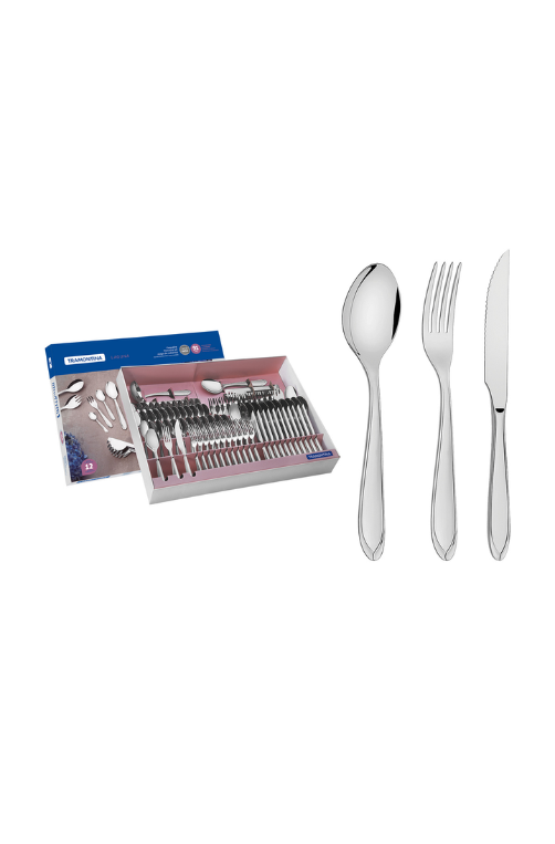 Contêm: 12 Colheres para Chá, 1 Garfo Trinchante, 12 Garfos para Mesa, 12 Garfos para Torta, 12 Colheres de Mesa, 1 Pegador de Massa, 12 Facas para Churrasco, 1 Concha para Feijão, 12 Colheres Média, 1 Pá para Bolo, 1 Colher para Arroz, 12 Colheres para Café e 2 Talheres para Salada.