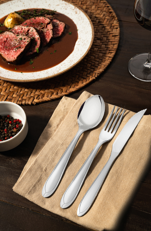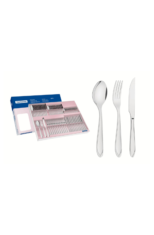 Contêm: 12 Garfos de Mesa, 12 Faca para Churrasco, 12 Colheres de Mesa, 12 Colher Média e 12 Colheres para Café.