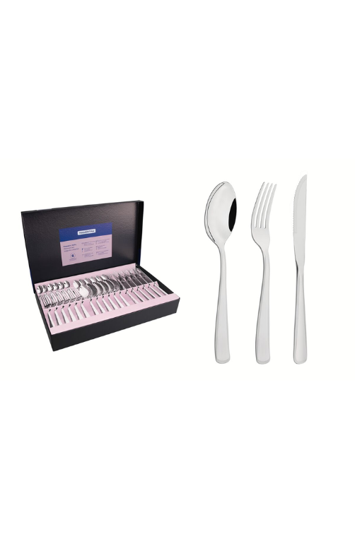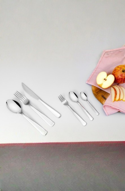 Contêm: 6 Garfos de Torta, 6 Garfos de Mesa, 6 Facas para Churrasco, 6 Colheres de Mesa, 6 Colheres para Café e 6 Colheres para Chá.