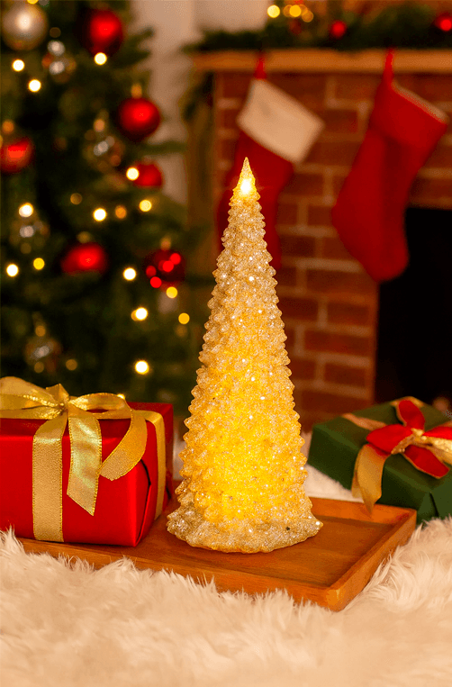 Árvore de Natal decorativa pequena dourada com glitter, perfeita para trazer brilho e sofisticação à sua decoração natalina. Ideal para compor mesas, aparadores ou prateleiras, cria um clima festivo encantador e elegante no ambiente.