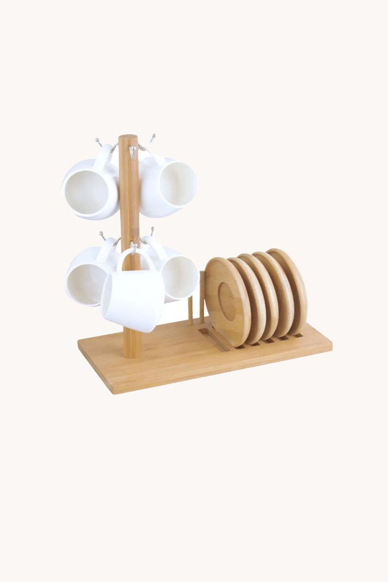 Cuidados:As xícaras devem ser lavadas com água morna e sabão neutro. O suporte em madeira pode ser limpo com pano seco, evitando umidade excessiva para preservar a madeira.