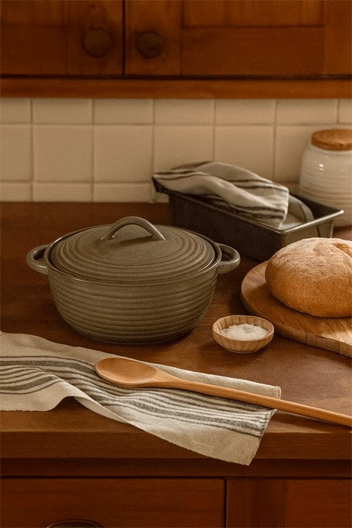 Com design rústico e elegante, esta caçarola de cerâmica é perfeita para servir com charme à mesa. Seu acabamento em relevo circular e tom neutro garantem um toque sofisticado à decoração, enquanto a tampa com pegador e as alças laterais oferecem praticidade no manuseio. Ideal para compor mesas postas aconchegantes ou dar um toque artesanal à sua cozinha.