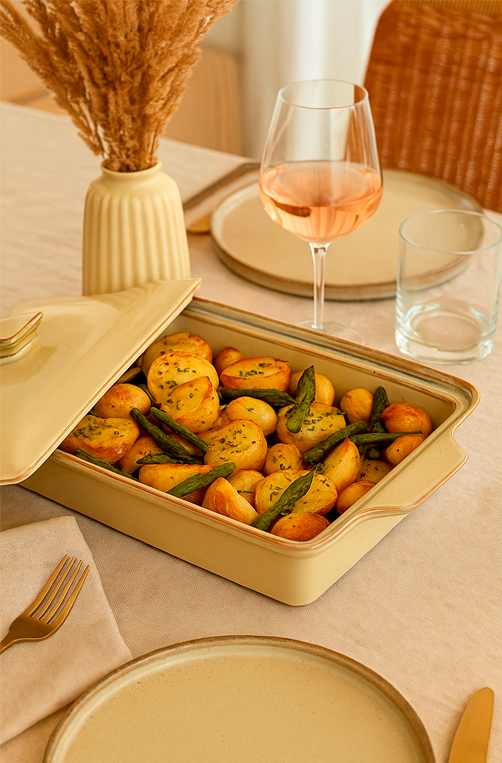 A Caçarola em Cerâmica com Tampa é perfeita para preparar e servir refeições com charme e funcionalidade. Com excelente retenção de calor, a cerâmica distribui o calor de forma uniforme, garantindo cozimento no ponto certo. Ideal para ensopados, sopas e assados, a tampa mantém os alimentos aquecidos por mais tempo e preserva o sabor. Seu design elegante permite levar a caçarola diretamente à mesa, complementando a decoração com um toque sofisticado.