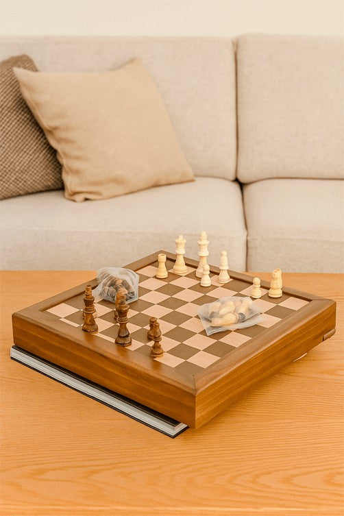 Elegante e funcional, este jogo de xadrez em madeira nogueira com acabamento em recouro café é a escolha ideal para quem valoriza estratégia e sofisticação na decoração. Com tamanho de 32x32x2,5cm, ele combina perfeitamente com ambientes modernos e clássicos, servindo tanto como passatempo quanto peça decorativa. Acompanha peças bem detalhadas e armazenadas em saquinhos plásticos para melhor organização.