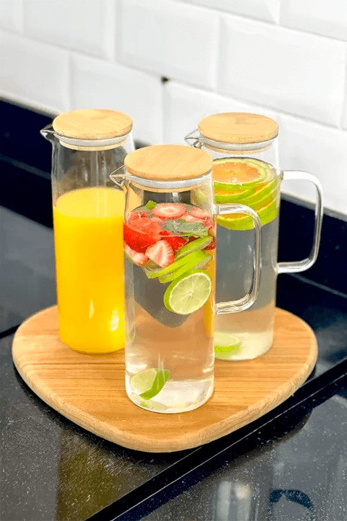 Esta Jarra De Vidro Para Água Ou Suco Com Tampa de bamboo é a adição perfeita para a sua cozinha ou mesa de jantar.