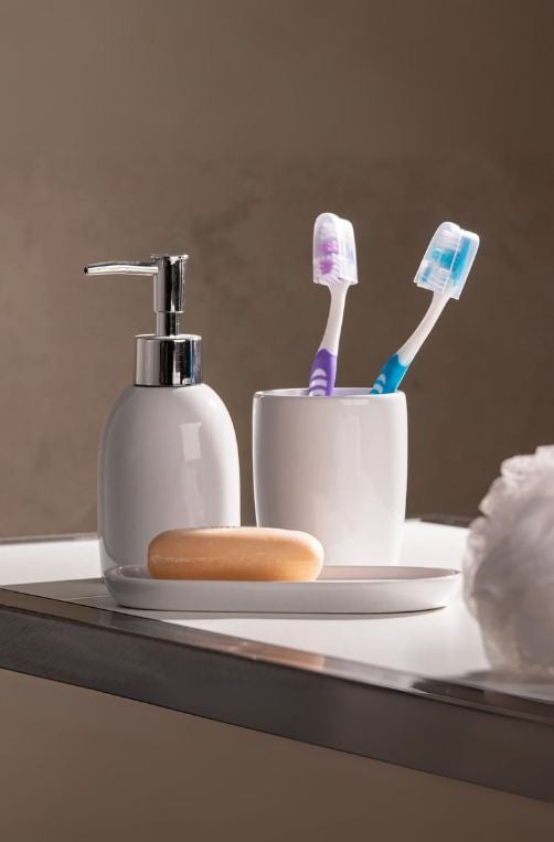 Transforme seu banheiro com o Conjunto 3 Peças para Banheiro de Cerâmica Londres Branco e Prata composto por dispenser para sabonete líquido, copo e bandeja organizadora. Com design minimalista e acabamento sofisticado, ele combina elegância e funcionalidade para deixar a bancada mais organizada e charmosa.