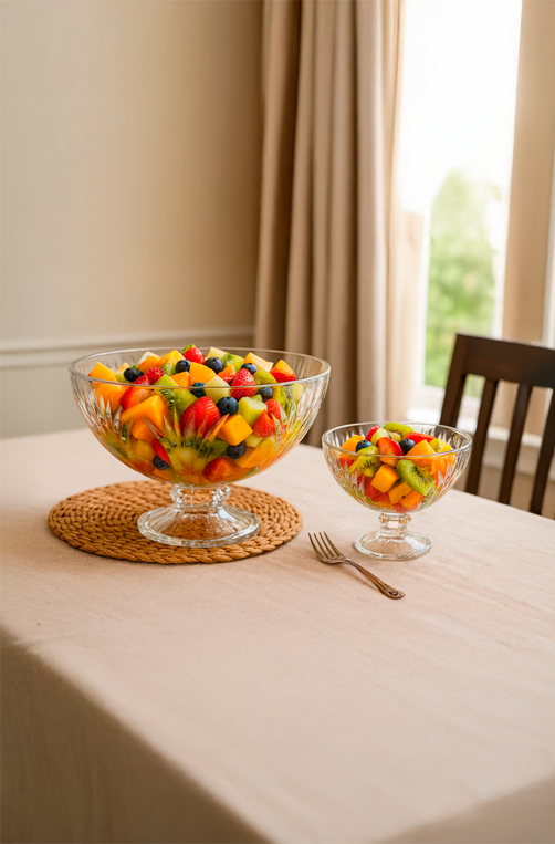 O conjunto inclui 1 travessa grande e 6 taças individuais, todas produzidas em vidro de alta qualidade, garantindo resistência, brilho duradouro e um visual atemporal que combina com qualquer ocasião, seja no dia a dia ou em refeições especiais.