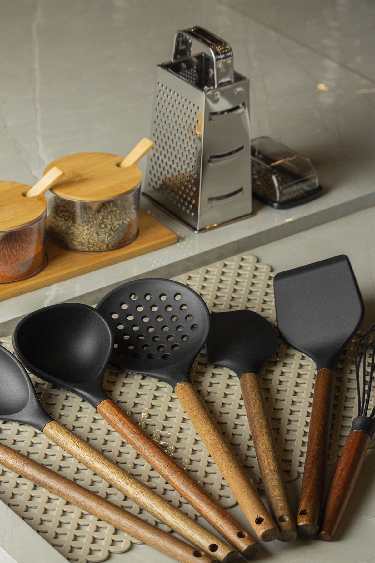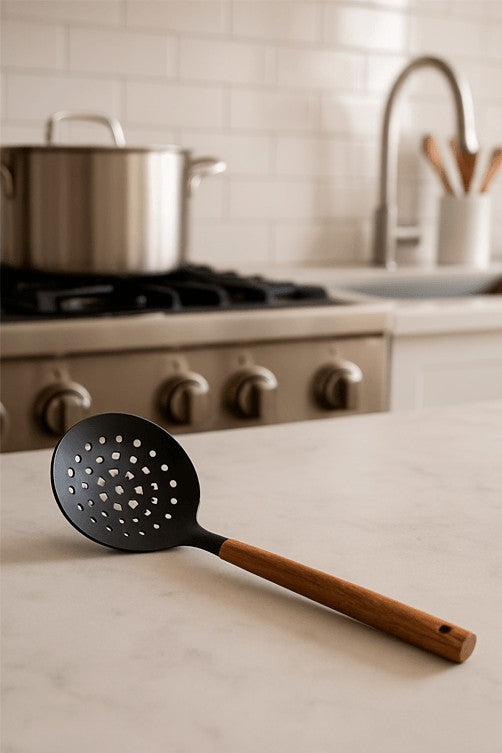A Escumadeira Pratic Chef é perfeita para preparar e servir alimentos com praticidade e segurança. Feita em silicone resistente ao calor, não risca panelas antiaderentes e proporciona um uso suave e eficiente. Seu cabo em madeira garante firmeza no manuseio e um toque sofisticado à sua cozinha. Ideal para escorrer frituras, massas e legumes cozidos com facilidade.