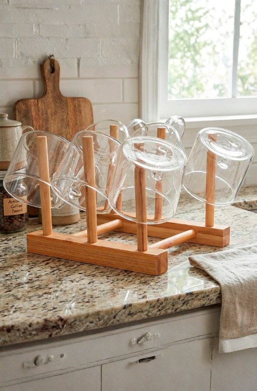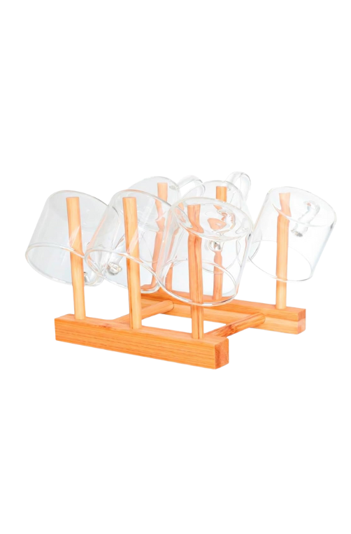 O vidro borossilicato é conhecido por sua alta resistência térmica, sendo perfeito para servir chás, cafés, infusões e bebidas quentes ou frias, sem perder a transparência e a sofisticação. O suporte em bambu mantém as xícaras organizadas, facilita o armazenamento e ainda funciona como um elemento decorativo para a bancada ou cantinho do café.