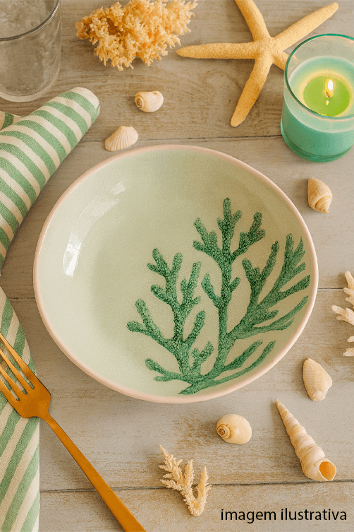 A Saladeira Coral Verde em Melamina é uma peça elegante e funcional que leva o frescor do mar para a sua mesa. Produzida em melamina de alta qualidade, apresenta formato inspirado em corais marinhos e acabamento em tom verde suave, que remete à natureza e ao estilo praiano. Leve, resistente e prática, é ideal para servir saladas, massas, frutas ou pratos frios com charme e descontração. Seu design moderno e temático valoriza composições tropicais, sendo perfeita para almoços ao ar livre e mesas de verão.